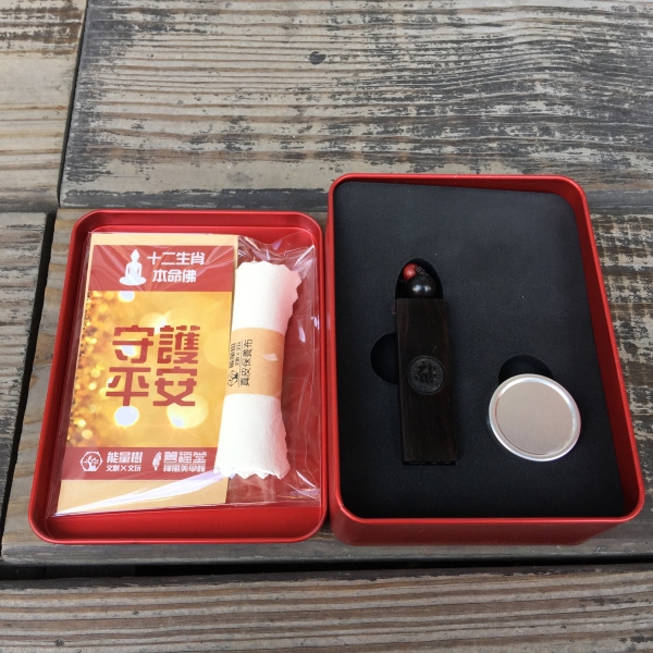 刻上各本命佛的佛種子字,黑檀木質地堅硬,百毒不侵,氣味芬芳且持久,故被認為是能?辟邪的吉祥物。項鏈底部刻有籇體『平安』兩字,可當作保平安印章印在紙或布上。