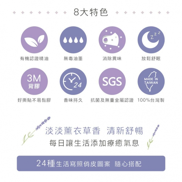 使用方法:撕開鋁裝外包裝、將貼片取出貼於建議位置,經接觸空氣揮發達到貼片周圍抗菌、除臭、香氛。產品為一次性拋棄式請勿重複使用,依個人口罩狀況隨時更換,產品拆封後使用環境時間不同遞減,最佳時間室內12-24小時,戶外8-12小時。