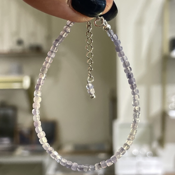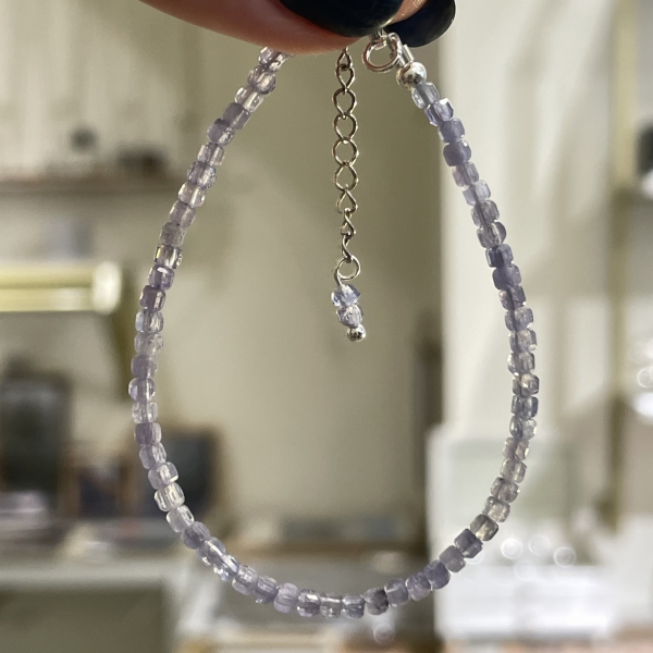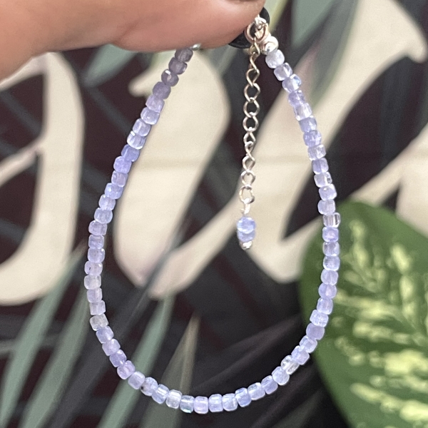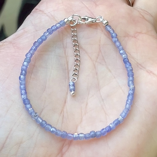 2.5mm〈丹泉石|坦桑石〉立方珠以鋼線串成手鍊,925純銀鉤環、延長鍊以雙顆丹泉石當吊飾。