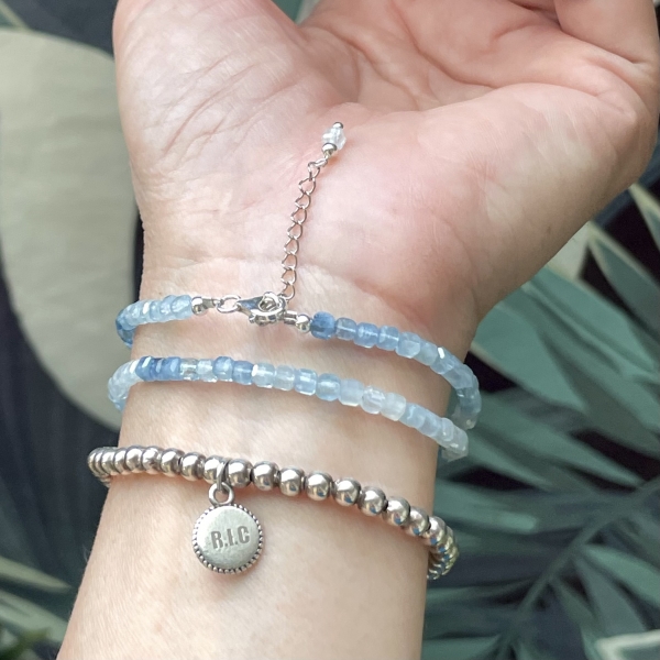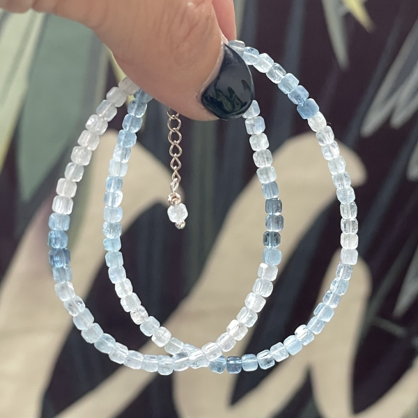 3mm〈海水藍寶〉立方珠以鋼線串成手鍊,925純銀鉤環、延長鍊以單顆海水藍寶石當吊飾。