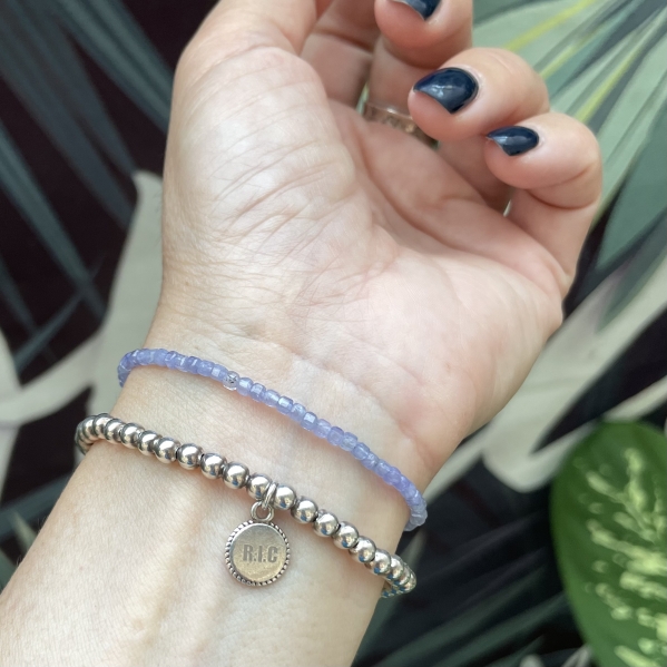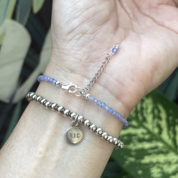 2.5mm〈丹泉石|坦桑石〉立方珠以鋼線串成手鍊,925純銀鉤環、延長鍊以雙顆丹泉石當吊飾。